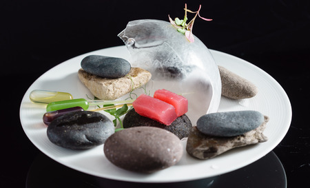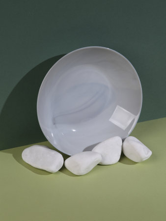 Minimalist still life. aesthetic composition. Plates with pebble stones on a green two-tone background