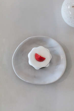 Delicious fresh chocolate cake with cream and strawberry on top. Traditional homemade dessert.
