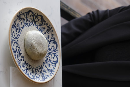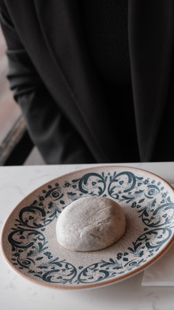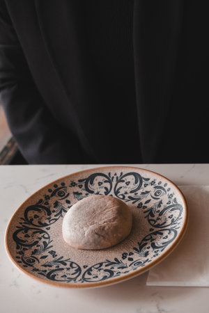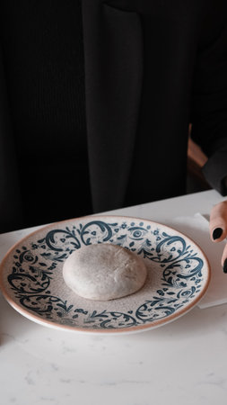 Steamed kebab with rotan in a bun. The dish lies in a round plate. Ready to serve.