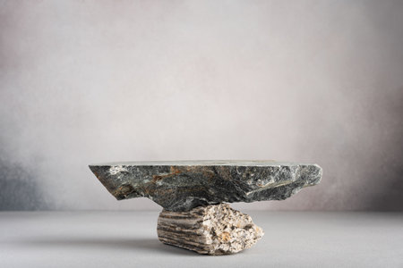 Presentation for product. Stone podium and pebbles on light gray background. Space for text