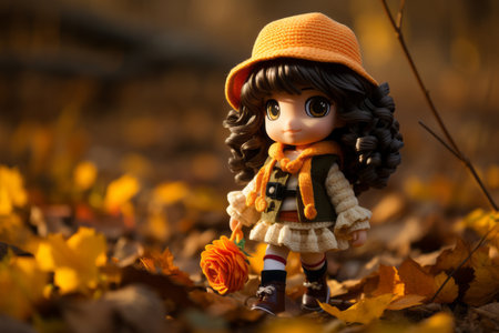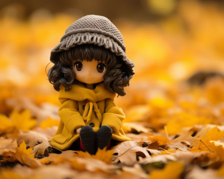 a doll in a yellow coat sits on the ground surrounded by fallen leaves