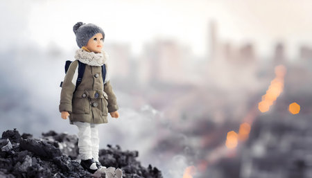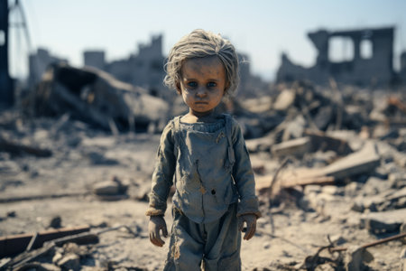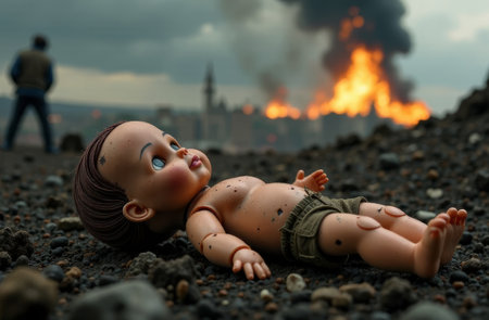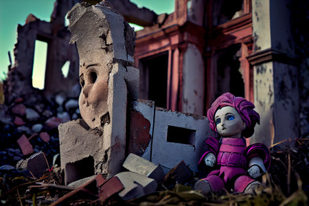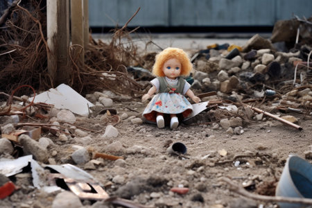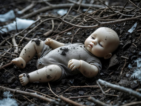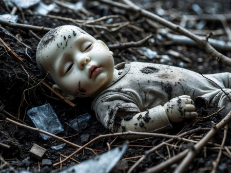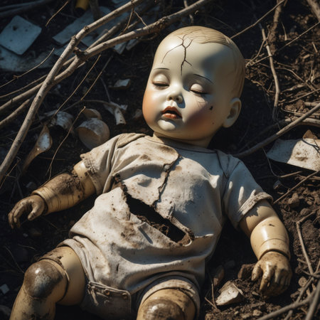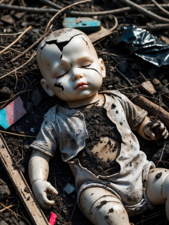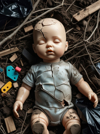 A cracked doll lies abandoned in the dirt, surrounded by broken twigs and debris. Its fractured surface and closed eyes evoke deep associations with trauma, war, and the silent suffering of forgotten childhoods. The image becomes a haunting symbol of innocence lost in disaster zones, whether shaped by conflict, earthquakes, or neglect.