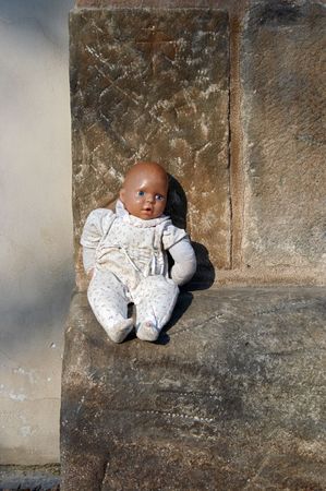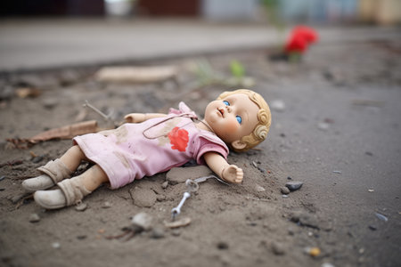 selective focus of dirty and scary baby doll on ground, post apocalyptic concept
