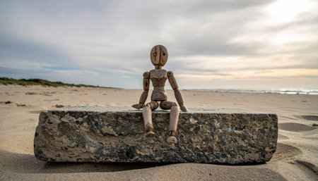 driftwood doll figure on beach stone slab under overcast softbox sky weathered wood minimal arrangement for coastal craft decor and organic art