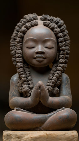 A unique clay character with large, expressive eyes displays a sense of wonder on a simple surface under gentle lighting, creating a whimsical atmosphere.
