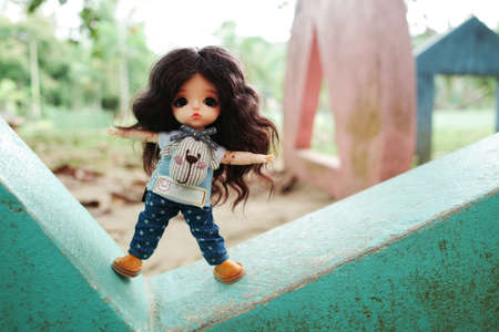 Thailand-October 16, 2021 : Cute girl doll is standing and posing for a photo in the playground. BJD (ball joint doll) This is doll resin brand lati size yellow.