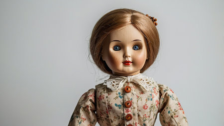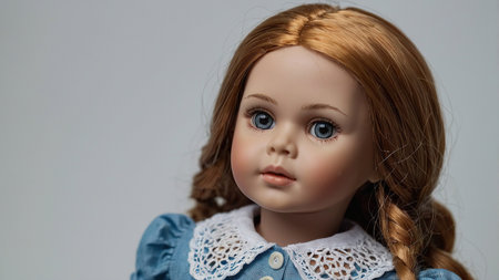 A beautifully crafted porcelain doll with striking features, dressed in a vintage outfit, exuding a sense of nostalgia and craftsmanship.