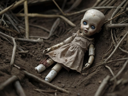 An old, cracked doll sits abandoned on a muddy forest path, surrounded by broken branches and decay. Its empty eyes and worn dress evoke a haunting sense of lost innocence. This image reflects themes of childhood trauma, abandonment, and the silent remnants of forgotten pain. It speaks to the emotional scars left behind