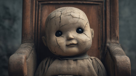 A haunting vintage doll seated on an old chair, featuring cracked skin and dark eyes. The eerie vibe creates a perfect atmosphere for Halloween or artistic settings.