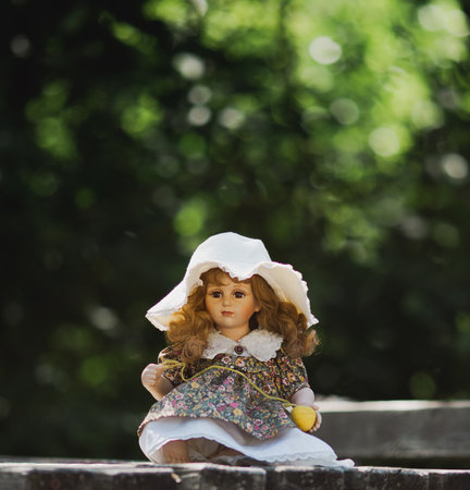 Amazing realistic vintage porcelain doll, toy with brown eyes, selective focus, antique shop concept, vintage market