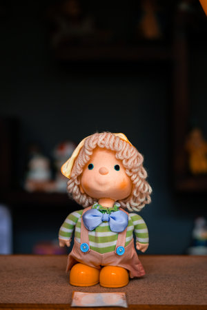 A charming vintage doll with curly hair and a playful outfit stands on a wooden surface, surrounded by a warm and inviting indoor atmosphere. The doll is cheerful and nostalgic.