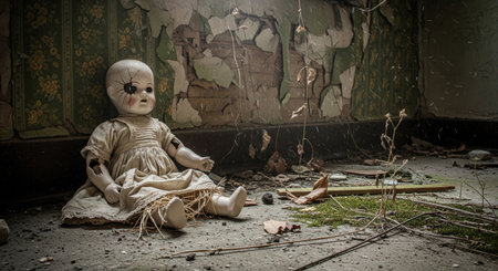 Horror style photo of a creepy old cracked doll sitting on the floor in a scary, abandoned and decayed room