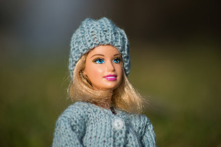 Mulhouse - France - 2 March 2021 - Portrait of Barbie doll wearing a woolen pullover and hat in a public garden