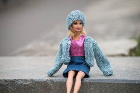Mulhouse - France - 2 March 2021 - Portrait of Barbie doll with woolen hat, blue jeans skirt and a pink top sitting in the street