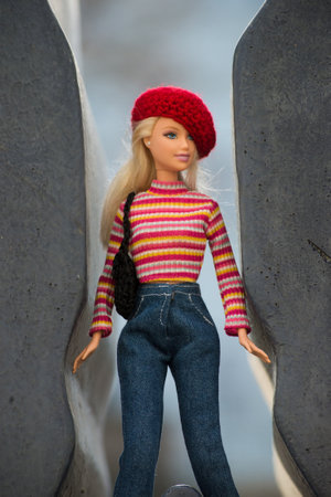Mulhouse - France - 16 March 2021 - Portrait of blond Barbie doll wearing a red woolen beret standing in the street