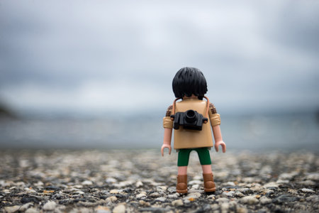 Brest - France - 9 July 2024 - Closeup of photographer playmobil standing in border ocean on cloudy sky background