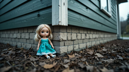 A blonde doll with large eyes and a blue dress sits on the ground amidst fallen leaves. The doll is positioned at the corner of a house with green siding and a brick foundation.