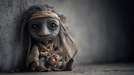 scary dolls or toys with distressed and weathered surfaces are captured in this close-up photo. the urban decay theme is enhanced by highly detailed illustrations. shot with a tokina at-x 11-16mm f/2.8 pro dx ii lens, this 32k uhd image showcases the eerie charm of these recycled playthings. ai generated