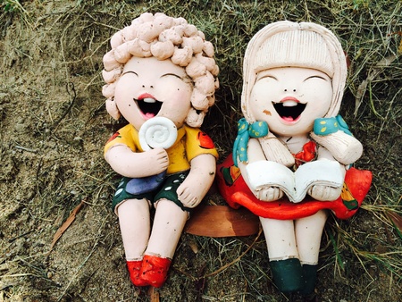 Miniature people - a couple of lover girl friend, twins, traveller with beautiful nature bokeh background