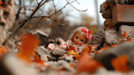 A haunting scene featuring an abandoned doll nestled among vibrant autumn leaves and crumbling bricks, evoking feelings of nostalgia and melancholy.