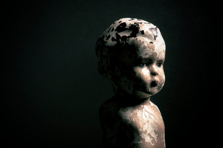 Face of cover kid girl 9-10 year old in doll image in black at dark textured wall, frozen eyes pose looking away. Pretty child with long hair isolated in shadow. Performing concept. Copy ad text space