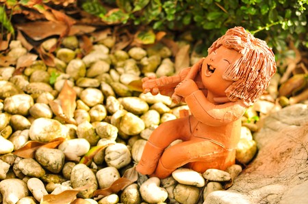 A delightful stone statue sits peacefully in a lush garden, surrounded by blooming yellow and purple flowers. The figure, wearing a hat, holds a small flower, showing tranquility in nature..
