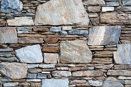 The wall of natural stone of gray and brown is laid out in the form of bricks with little rocks between them. Building from ecological material, construction background from rock texture close-up.
