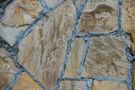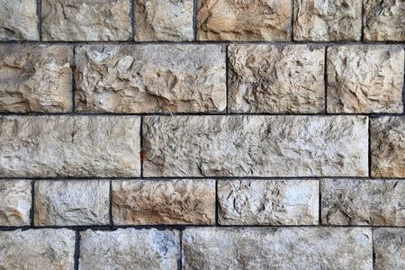 Decorative coating, texture. Rough natural stone is staggered. Thick concrete joints. Muted tones.