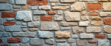 This captivating stone wall features an intricate arrangement of light and dark stones, creating a harmonious blend of textures and colors. The warm hues of the bricks and the cool tones of the stones evoke a sense of rustic charm, perfect for enhancing any interior or exterior space.