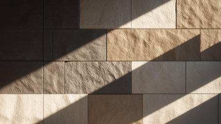 A beautiful close-up of a textured stone wall illuminated by natural light, creating intriguing shadows that enhance the warm tones, ideal for interior aesthetics.