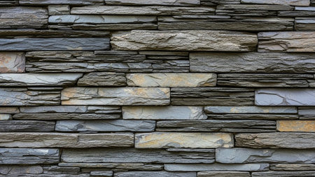 Detailed close-up of a grey slate stone wall showcasing rough layered textures and distinct grout lines between blocks.