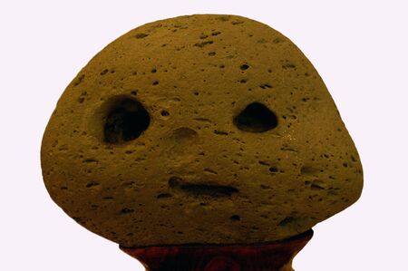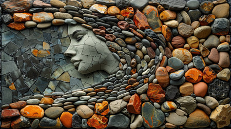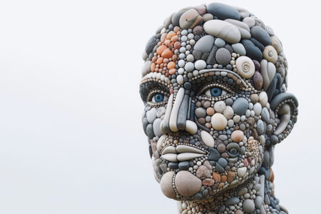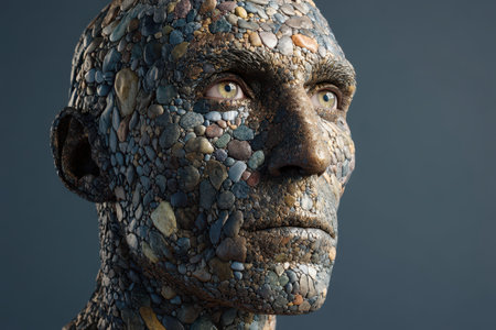 Human head made of variously sized stones, creating a textured mosaic effect. The stones cover the entire face, giving an artistic, surreal appearance with a focus on the detailed surface