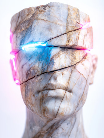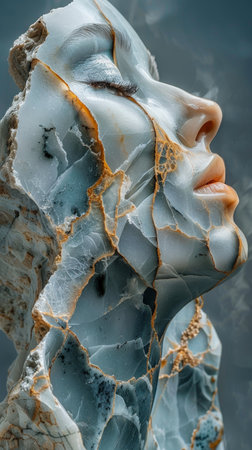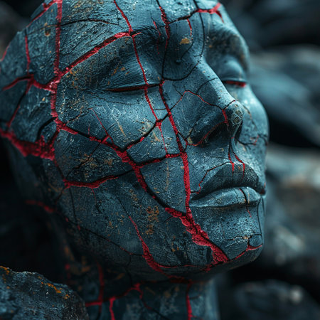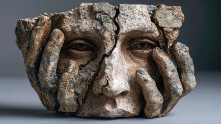 This artwork features a stunning sculpture representing a cracked face with hands, embodying themes of duality and deeper emotions in a contemporary artistic style.