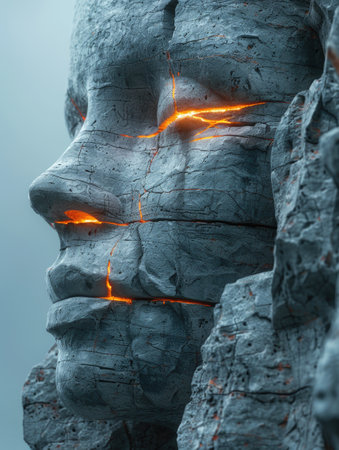This striking close-up features a sculpted face with a richly textured, cracked surface. The serene expression and closed eyes evoke a sense of ancient artistry and emotional depth, capturing the essence of human representation in stone.