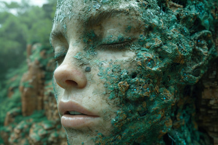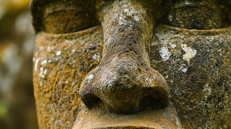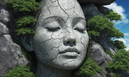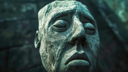 stone statue with moss-covered eyes on a wall, showcasing powerful and emotive portraiture. captured with a canon eos 5d mark iv, the image highlights the intricate facial features and shallow depth of field. the ambient occlusion adds depth to the transcendental dreaming, reminiscent of buddhist art and architecture. ai generated