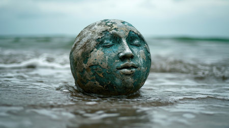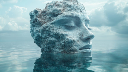 A surreal image of a stone face sculpture submerged in tranquil ocean waters, blending art and nature.