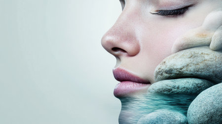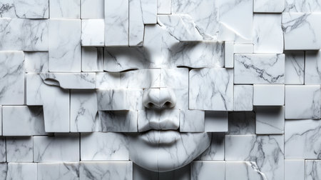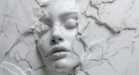 This artwork features an abstract sculpture of a woman's face seamlessly integrated into a textured marble wall, capturing modern minimalism and elegance.