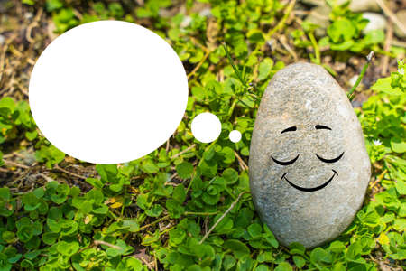Natural stone with drawn funny face and speech bubble with copy space. Empty template for advertisement, sale banner, motivation poster etc.