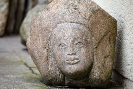 A close-up view presents an antique stone carving of a male face. The sculpture features textured hair and a detailed beard, with visible wear and tear. The color palette includes gray and blue tones, suggesting an outdoor setting. This image is suitable for various commercial or editorial applications.