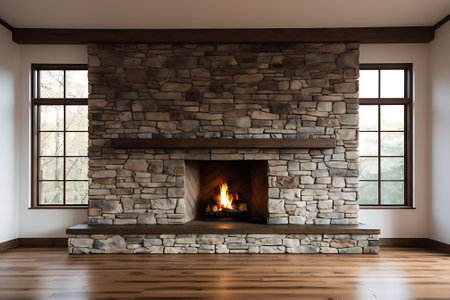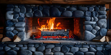 Rustic stone fireplace background with rough texture and natural gray and brown hues: Warm and inviting, perfect for a cozy and vintage look