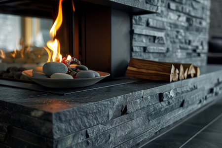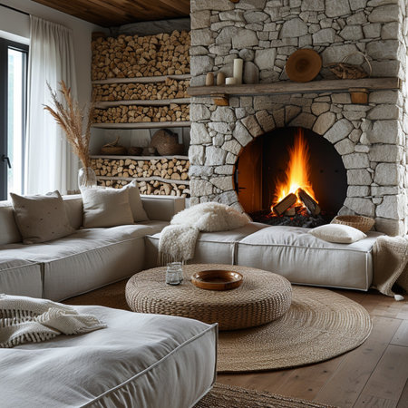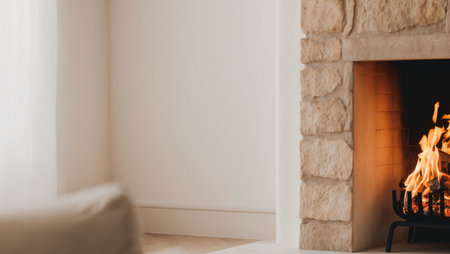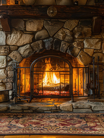Cozy autumn evening by a stone fireplace with warm flames and seasonal decor in a serene home setting