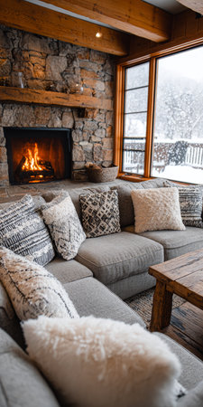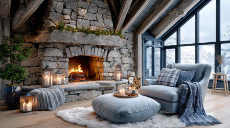 Cozy winter living room with stone fireplace and mountain view for a relaxing holiday ambiance.