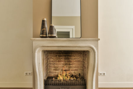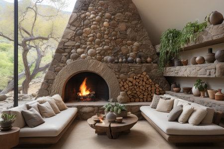 A stone fireplace in a living room. ai generative.