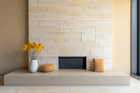 A bright indoor space showcases a smooth stone wall a simple mantel and a soft beige floor. Decor includes a flower vase with yellow blooms and cushions creating a cozy atmosphere.