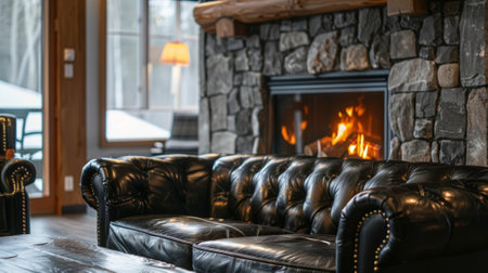 The black leather sofa sits adjacent to the fireplace inviting guests to cozy up and enjoy the crackling fire. 2d flat cartoon