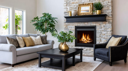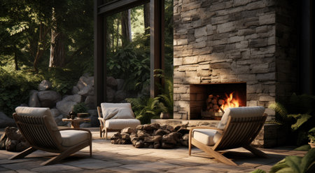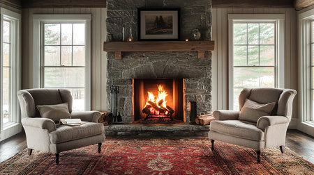 A warm and inviting living room featuring a large stone fireplace, modern armchairs, wooden furniture, and soft lighting. The space combines rustic and contemporary elements for a cozy ambiance. AI generated image