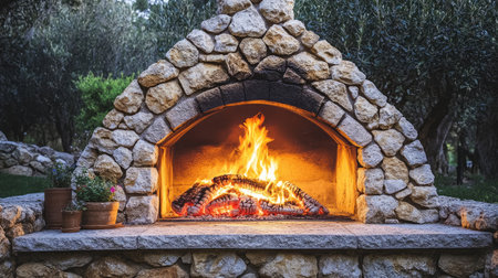 This image captures a rustic stone fireplace with vibrant flames that create a warm and inviting atmosphere in a tranquil garden setting at dusk.