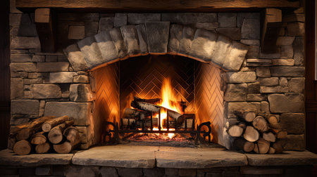 Cozy rustic stone fireplace in wooden cabin interior with warm flames. That the image is generated using AI.