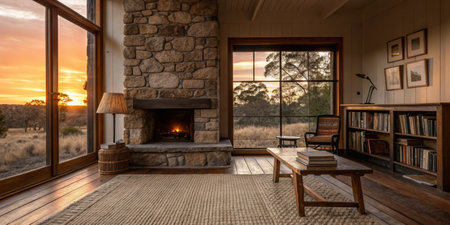 A rustic cabin features a stone fireplace and wooden furniture, showcasing a cozy atmosphere. Large windows reveal a beautiful sunset over the countryside landscape.