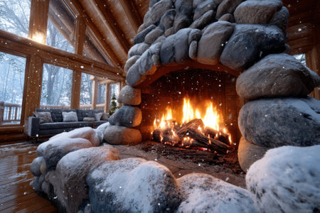 Cozy stone fireplace glowing warmly amid snowy forest scenery during winter evening